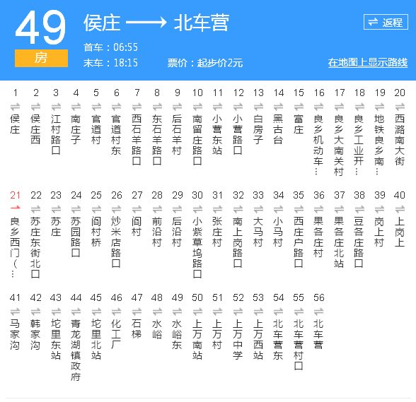 侯庄→良乡西门7:55、9:25、11:55、14:00、15:25、18:05